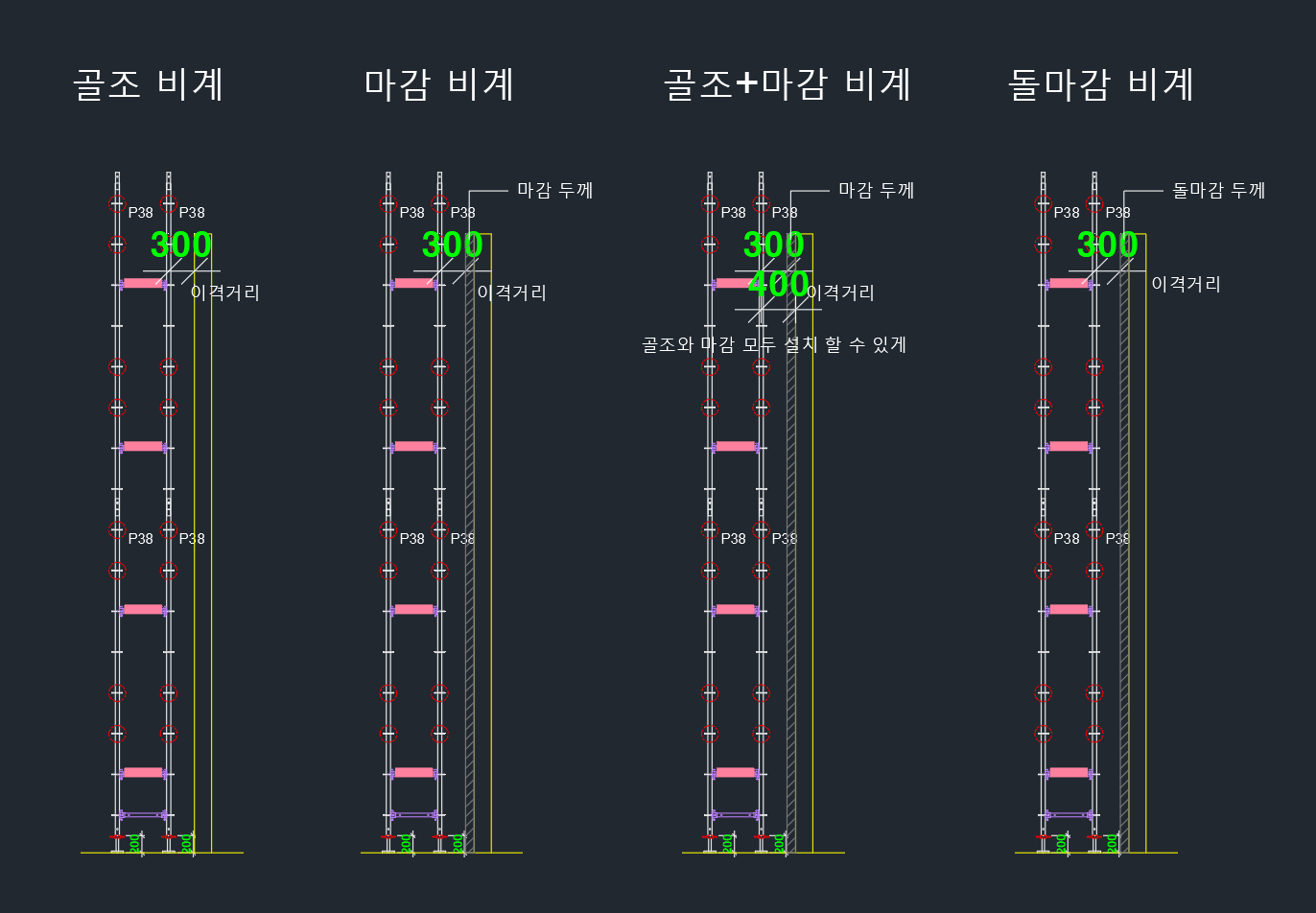 마감 두께 300mm 초과 : 현장측과 협의 필요 (주주브라켓을 쓸것인지, 단관비계로 보강할지, 뜯고 새로 설치할 지 등)